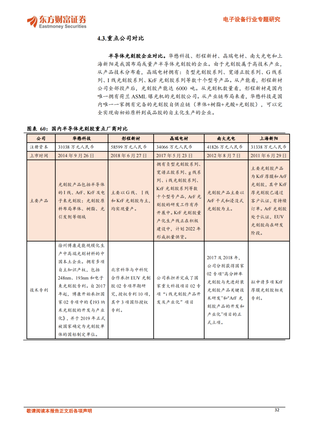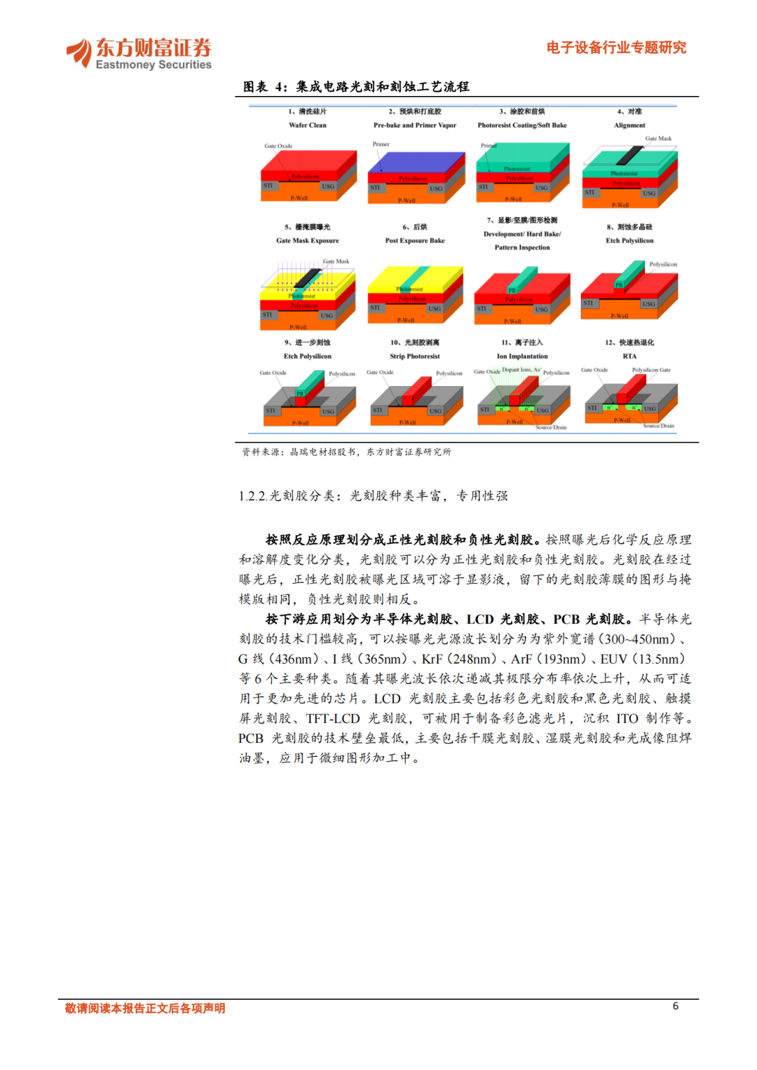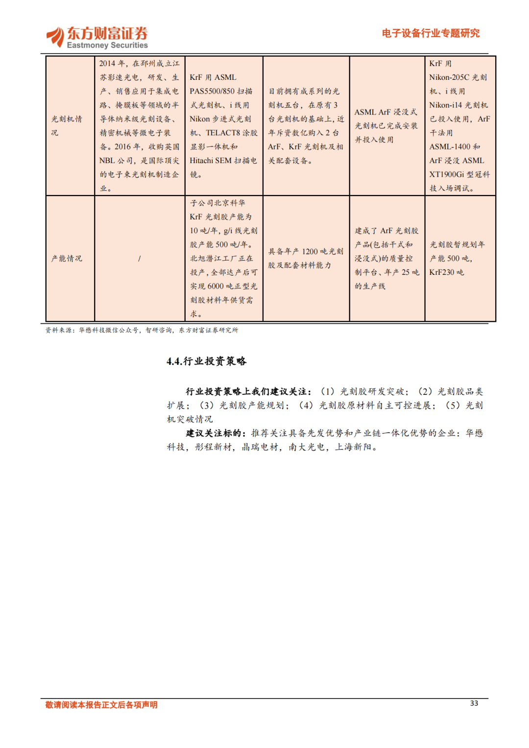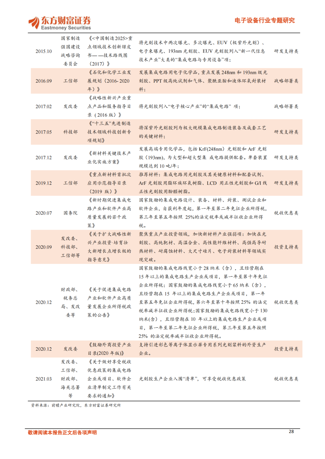 ◆ 行业投资策略上我们建议关注:(1)光刻胶研发突破;(2)光刻胶品类扩展;(3)光刻胶产能规划;(4)光刻胶原材料自主可控进展;(5)光刻机突破情况。