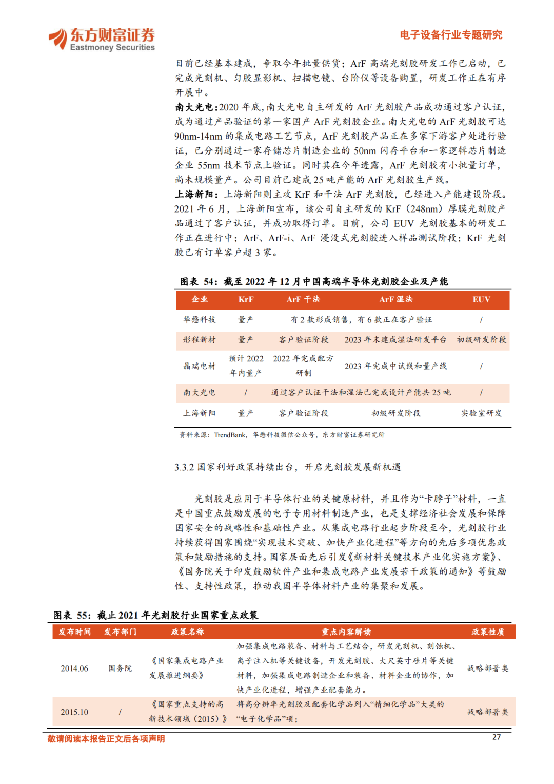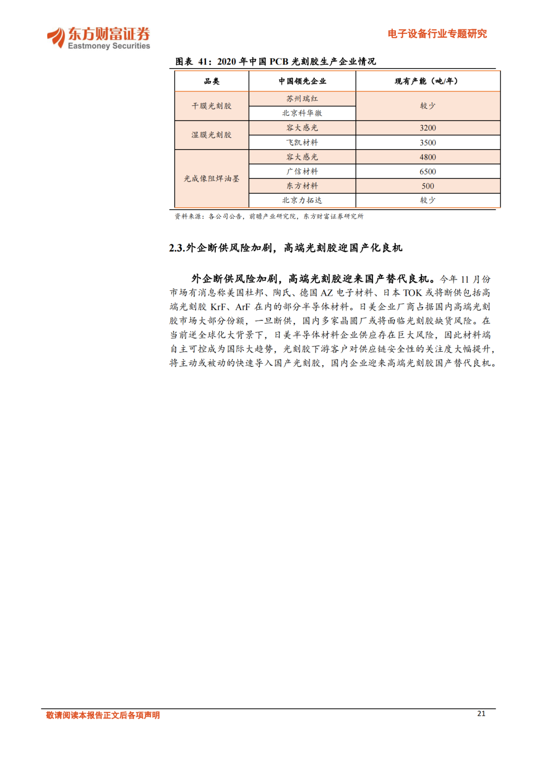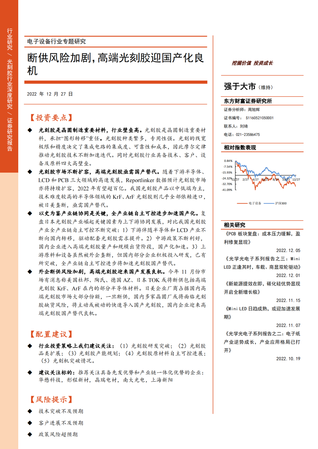 ◆ 外企断供风险加剧,高端光刻胶迎来国产发展良机。今年 11 月份市场有消息称美国杜邦、陶氏、德国 AZ、日本 TOK 或将断供包括高端光刻胶 KrF、ArF 在内的部分半导体材料。日美企业厂商占据国内高端光刻胶市场大部分份额,一旦断供,国内多家晶圆厂或将面临光刻胶缺货风险,将主动或被动的快速导入国产光刻胶,国内企业迎来高端光刻胶国产替代良机。