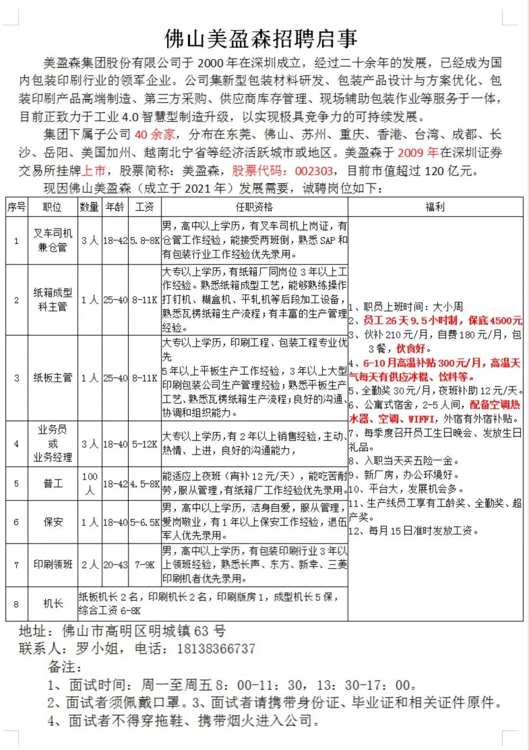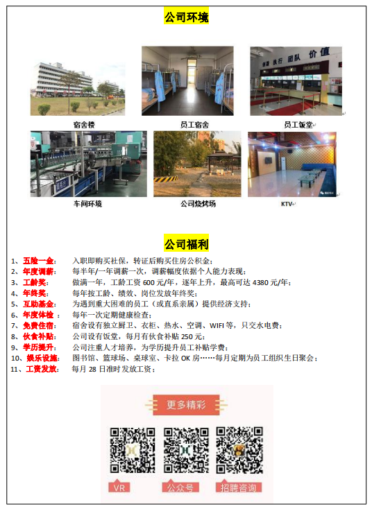 职位:要求能吃苦耐劳,工作认真负责,有责任心,服从工作管理安排。