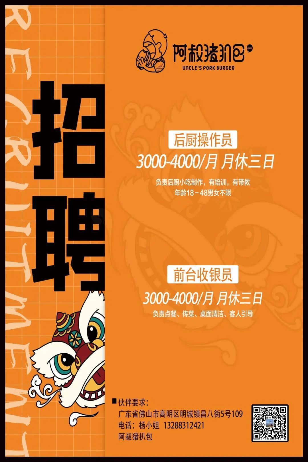 工作地址:高明区荷城街道新亨广场正门,鱼当道餐厅。