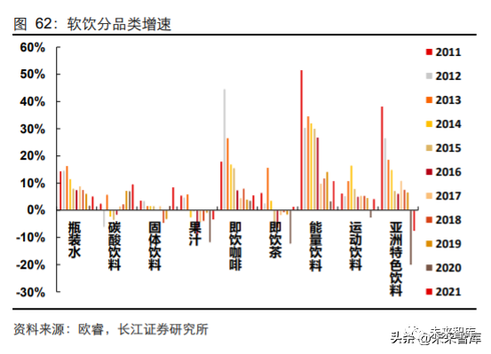 消费者世代更迭驱动软饮的品类不断向更精准的功能定位+更好的风味的方向迭代。新 世代消费者的个性化要求更加凸显,不同功能需求的场景被不断分割,例如:健康意识 的觉醒使得无糖、天然水等符合健康化趋势的细分标签助力品类获得较快的渗透;与此 同时消费者对口味要求也未降低,带有季节限定、区域限定等风味特色的产品也收获追 捧,创造更多的附加值。