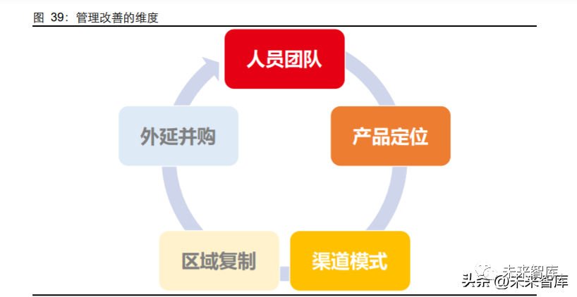 在需求平稳复苏、格局边际优化的背景下,上市公司在组织机构、战略布局层面的改善, 则可以带来超越预期的阿尔法机会。公司的管理变化可分为如下 5 个维度解构:人员团队:1)核心团队、关键人员的调换或带来公司经营方向、企业文化的转变;2)团队激励(薪酬 KPI、股权激励)也会带来企业战略的执行落地带来变化。产品定位:1)产品定位的梳理、聚焦有助于突出差异化,绑定目标客群;2)核心 产品之外的品类延伸裂变或打开新的增长曲线。渠道模式:1)商业模式延展,从 B 端到 C 端又或反之,挟原有模式下的竞争优势 跨界竞争;2)在 B 端或 C 端模式内部,实现产品延展(例如:B 端餐饮+团餐;C 端线上+线下)。区域复制:1)走出基地市场,检验产品的普适性、研发能力的本地化;2)从强消 费能力的一二线市场渗透至(并研发产品以兼容)弱消费能力的乡镇市场等,反之 亦然。外延并购:1)激烈的竞争格局中,并购出现危机的对手,从而加速出清,获得更 良性的盈利水平;2)补足短板(供应链、渠道模式、区域),实现经营协同。