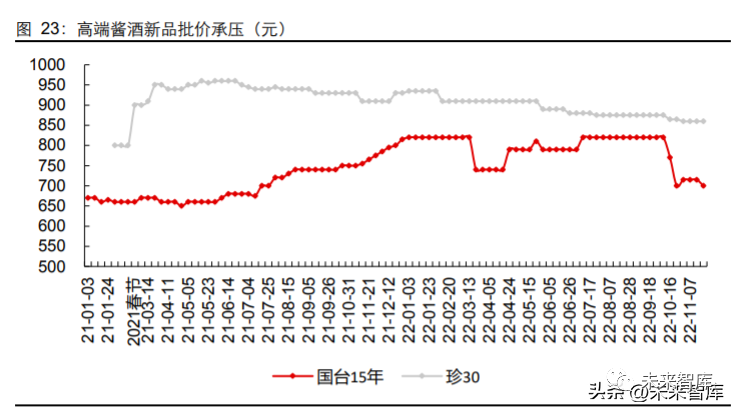 次高端白酒受限于消费场景缺失、与消费能力承压,2022 年动销压力较大,展望未来, 长期看次高端价格带成长空间仍广,聚焦 2023 年,次高端价格带有望跟随行业整体逐 步修复、预计量在价先。次高端及以上价格带目前在白酒行业整体销售占比预计仅在个 位数,未来长期成长空间广阔。聚焦 2023 年,价格层面,过去几年次高端价格红利显 著,除高端价格带持续向上打开升级空间外,酱酒品牌火速在次高端的占位也带动传统 次高端品牌价位的提升,但近几年快速扩张后,较多酱酒品牌出现渠道库存压力较大等 问题,部分产品批价跌回 2021 年年初水平,未来价格再向上需先经历渠道库存去化,因此我们认为次高端整体修复节奏上量或在价先。