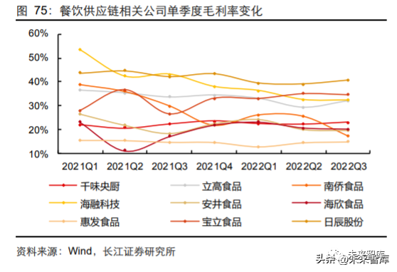 大宗成本的分化走势下,期待毛利率的进一步修复。餐饮供应链相关公司中,除南侨食 品由于未采取锁价直面成本压力导致毛利率下行压力较大外,其余公司基本保持平稳或 提升;提升幅度较快的代表型公司包括立高食品、日辰股份等,主要受益于原材料的锁 价保护、产品结构变化等。食品连锁相关公司中,元祖股份及一鸣食品呈现改善趋势, 但以肉制品销售为主的公司成本压力略有加大。