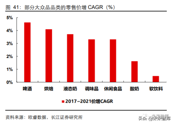 啤酒是零售价提升较快的食饮品类,但产品主流档次仍然以中低档为主。结合消费端零售价格统计,啤酒在过去 5 年来的零售均价涨幅也确实领先于大部分的食 饮品类,从啤酒消费的零售价看,2017 年行业龙头开启高质量发展的元年,也是价格 竞争逐步出清的阶段,非现饮的啤酒零售均价仅约为 4 元/500ml(同款啤酒产品在餐饮、 娱乐等现饮渠道普遍存在 50~100%的加价,且现饮渠道的产品结构相对更高档,因此 零售均价更高),截至 2021 年非现饮的消费均价仍然仅为 5 元/500ml,也就是说从目 前的产品消费档次看,国内最主力的消费量仍然是来自中低端的产品,包括:雪花清爽、 崂山清爽/青岛冰醇、燕京精品、山城冰爽等。