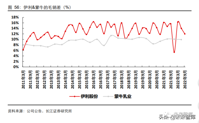 格局走向改善,带来盈利提升的拐点。伊利和蒙牛的毛销差拉长周期看处于提升趋势中, 过去两次毛销差拐点 2011 和 2014 年催化因素均与上游原材料供给短缺、价格上涨同 步。随着格局趋于稳定,龙头公司也更加聚焦产品升级,推动自身盈利改善。