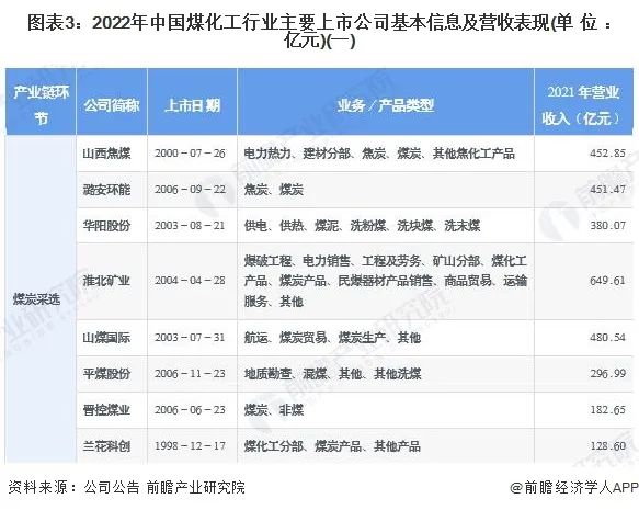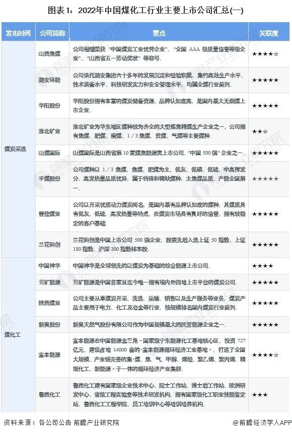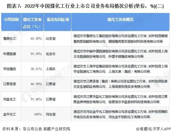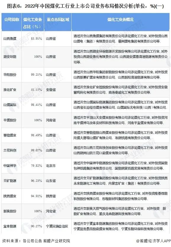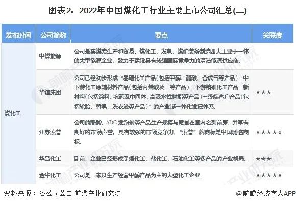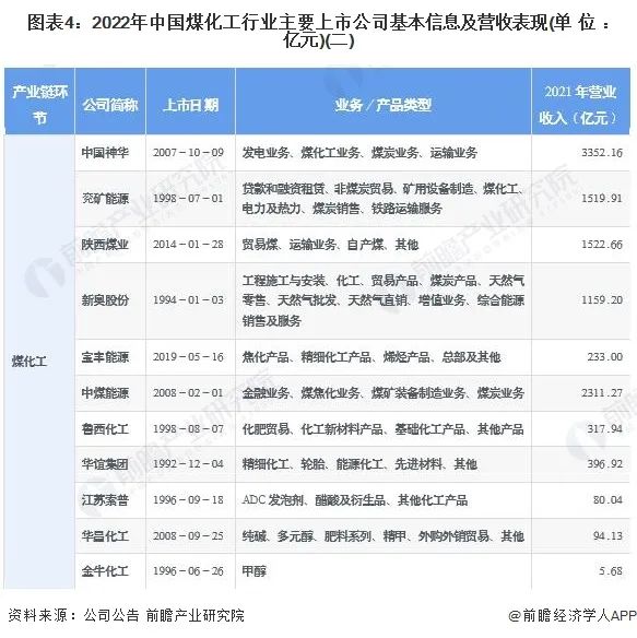 煤化工行业的上市公司中,中国神华、兖矿能源和陕西煤等公司的煤化工业布局最广;其他公司则基本通过开设方式或投资(全资或部分出资)煤化工行业相关公司,参与煤化工相关业务的经营。
