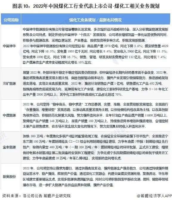 根据《关于“十四五”推动石化化工行业高质量发展的指导意见》,“十四五”期间,我国将着重就丰富精细化学品和化工新材料供给,强化行业本质安全和清洁生产,推进煤化工、石油化工等协调发展,发挥化工产业优势助力实施“双碳”战略;石化、煤化工等重点领域企业主要生产装置自控率95%以上,建成30个左右智能制造示范工厂、50家左右智慧化工示范园区;强化分类施策,科学调控石油化工、煤化工等传统化工行业产业规模,有序推进炼化项目“降油增化”,促进煤化工产业高端化、多元化、低碳化发展;统筹项目布局,推进新建石化化工项目向资源环境优势基地集中,推动现代煤化工产业示范区转型升级;发挥碳固定碳消纳优势,有序推动石化化工行业重点领域节能降碳,推进炼化、煤化工与“绿电”、“绿氢”等产业耦合以及二氧化碳规模化捕集、封存、驱油和制化学品等示范。据此,煤化工行业的龙头企业-中国神华、兖矿能源、陕西煤业和中煤能源等公司也相应提出了其2022年于“十四五”时期的煤化工发展目标:更多本行业研究分析详见前瞻产业研究院《中国煤化工产业发展前景预测与投资战略规划分析报告》,同时前瞻产业研究院还提供产业大数据、产业研究、政策研究、产业链咨询、产业图谱、产业规划、园区规划、产业招商引资、IPO募投可研、IPO业务与技术撰写、IPO工作底稿咨询等解决方案。前瞻产业研究院创立于1998年清华园,2002年总部设深圳,致力于为企业、政府、科研院所提供具有前瞻性的产业咨询服务。目前前瞻已服务20万家企业,成为600多个地方政府智库机构,累计服务1800多个产业园,已辅导500多家企业上市成功。专注于:产业研究、专项调研、产业规划、产业转型升级、产业布局、产业招商、IPO咨询(募投可研、业务与技术撰写、工作底稿咨询)、产业大数据平台搭建等解决方案。