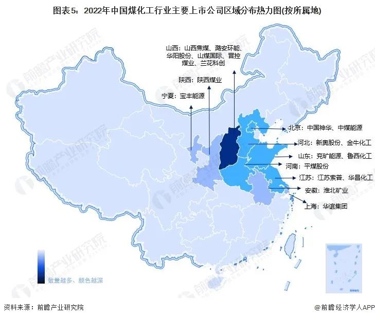 从煤化工行业产业链的参与企业上看,煤化工产业的上游为煤炭采选行业,为其煤化工行业企业提供原材料,参与企业主要有神华集团、山西焦煤等;煤炭价格波动直接影响煤化工行业的生产成本,进而对细分产品的利润产生影响。煤化工按加工深度不同,可分为产业链上游的基础煤化工和中下游的精细煤化工;按发展成熟度不同,可分为传统煤化工和现代煤化工。传统煤化工主要包括煤制化肥、合成氨和焦炭,现代煤化工主要是新型煤基能源和新型煤基材料,中游煤化工企业主要包括中国神华、中煤能源和陕西煤业等。煤化工下游应用较为广泛,其产品多为工业领域的原材料,涉及燃料、医药业、农业、制造重轻工等各个领域。截至2022年10月我国煤化工行业主要上市公司汇总如下:2022年中国煤化工行业上市公司基本信息及营收表现汇总如下:从我国煤化工行业主要上市公司区域分布热力图来看,我国煤化工行业上市公司较为集中的分布在山西省,区域内上市公司数量较多且公司规模较大,拥有如山西焦煤、华阳股份和山煤国际等煤炭行业龙头企业;除此之外,北京、河北、山东和江苏等省市也有较多煤化工行业竞争者分布,如中国神华、中煤能源、新奥股份、兖矿能源和华昌化工等。2022年我国煤化工行业主要上市公司区域分布如下: