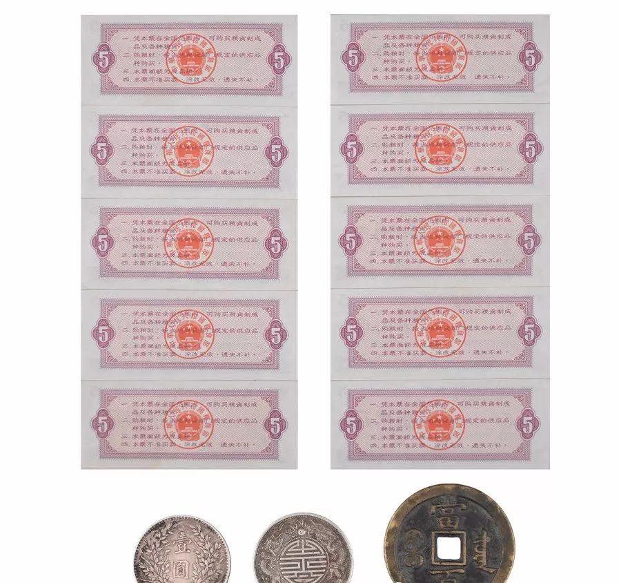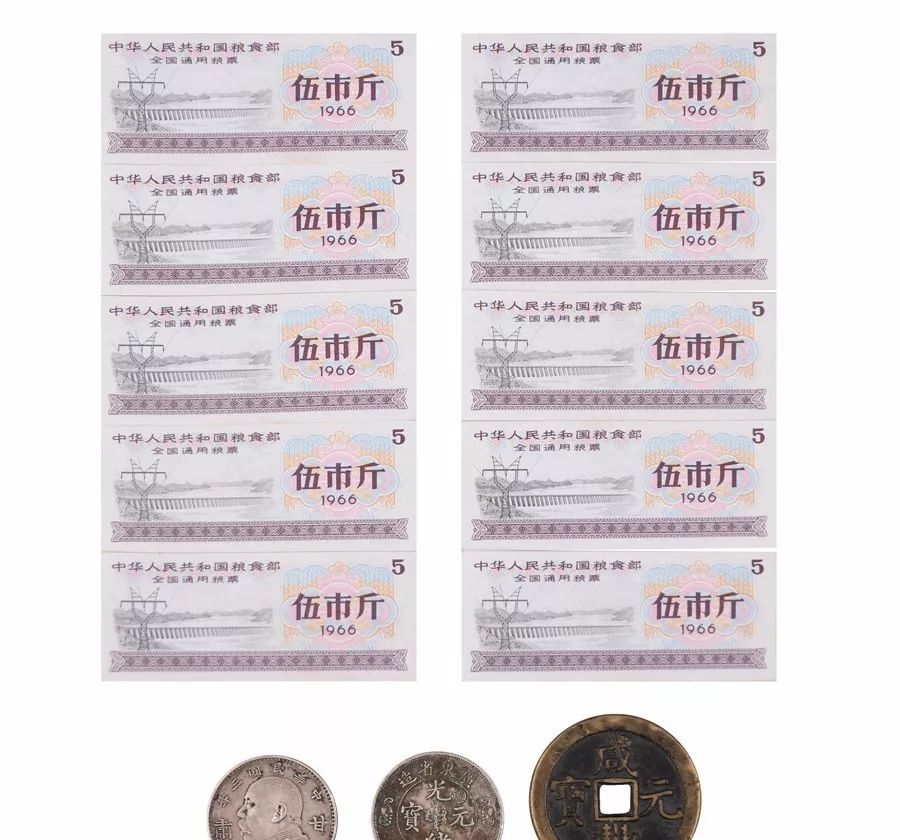 此组藏品为“1966年全国通用粮票伍市斤”“甘肃版 袁大头”“光绪元宝广东省造库平七钱二”“咸丰重宝当十铜元”。