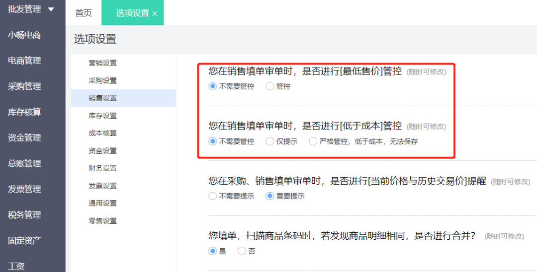 避免出现恶意低价销售,可以设置低于成本价和最低售价不允许开单,保障不亏本销售;
