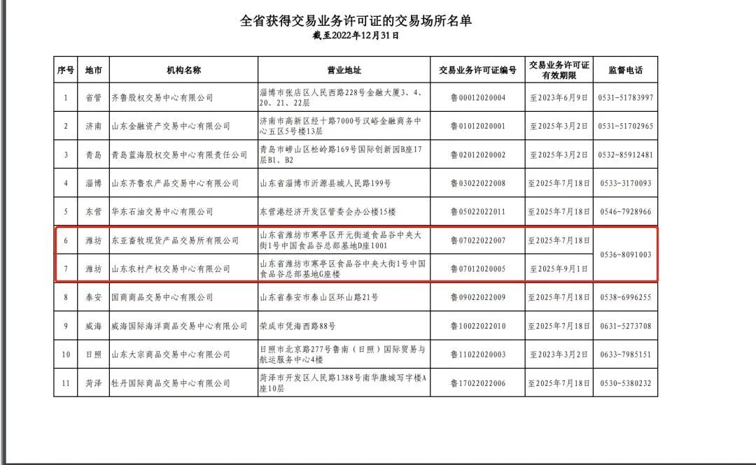 近日,山东省地方金融监管局公布全省获得交易业务许可证的11家交易场所名单,包括4家权益类交易场所,7家介于现货与期货之间的大宗商品交易场所。其中,潍坊仅有农综区山东农村产权交易中心有限公司、东亚畜牧现货产品交易所有限公司2家企业入选。