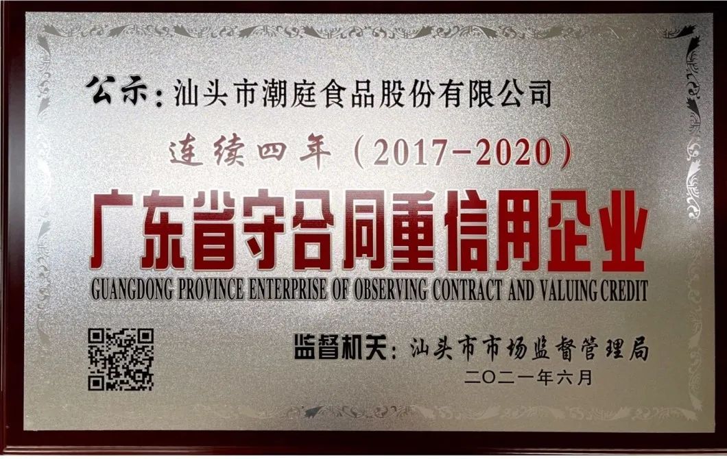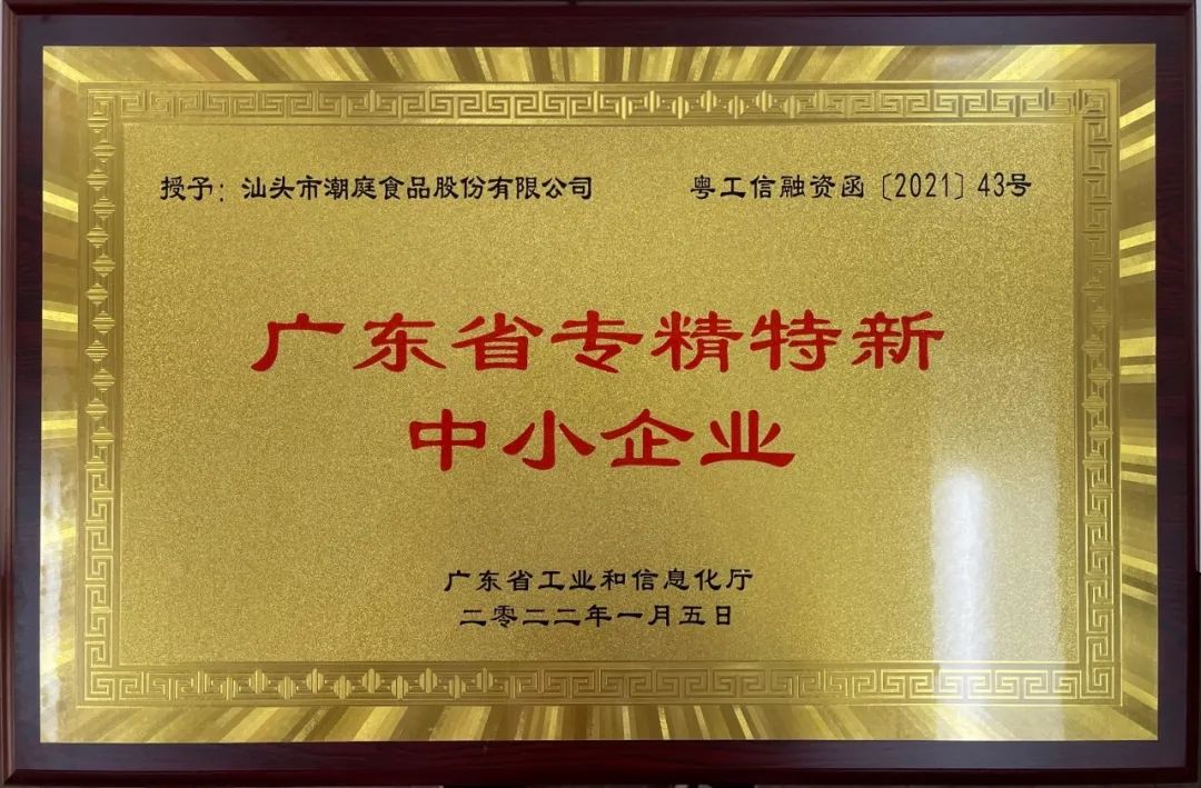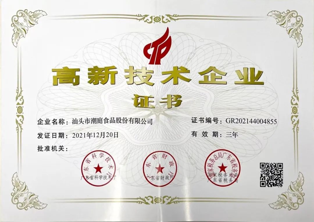 2018 年 公司取得了由广东省科学技术厅颁发的《广东省潮汕特色美食工程技术研究中心》的资格;