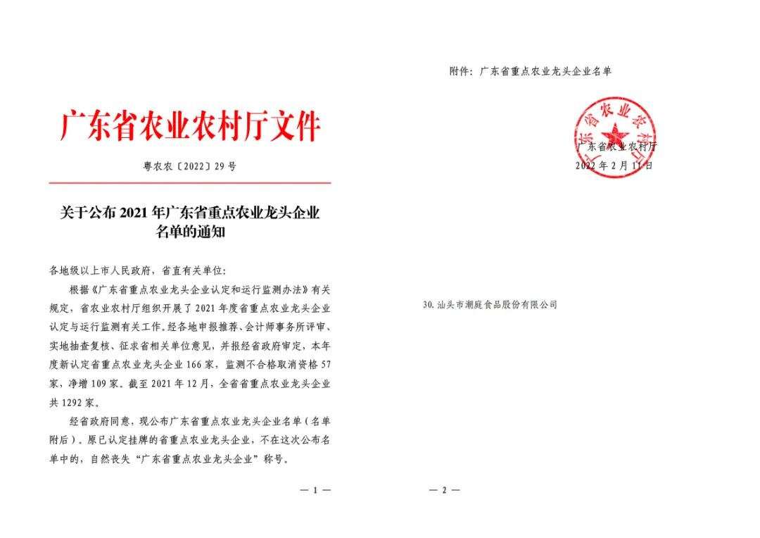 2022年2月公司被评为“广东省重点农业龙头企业”