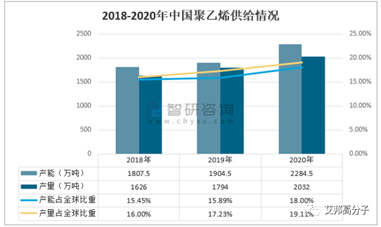 目前,我国聚乙烯消费仍处于快速增长阶段,2020年中国聚乙烯产能为2284.5万吨,占全球总产能的18.0%;产量为2032万吨,占全球总产量的19.11%。