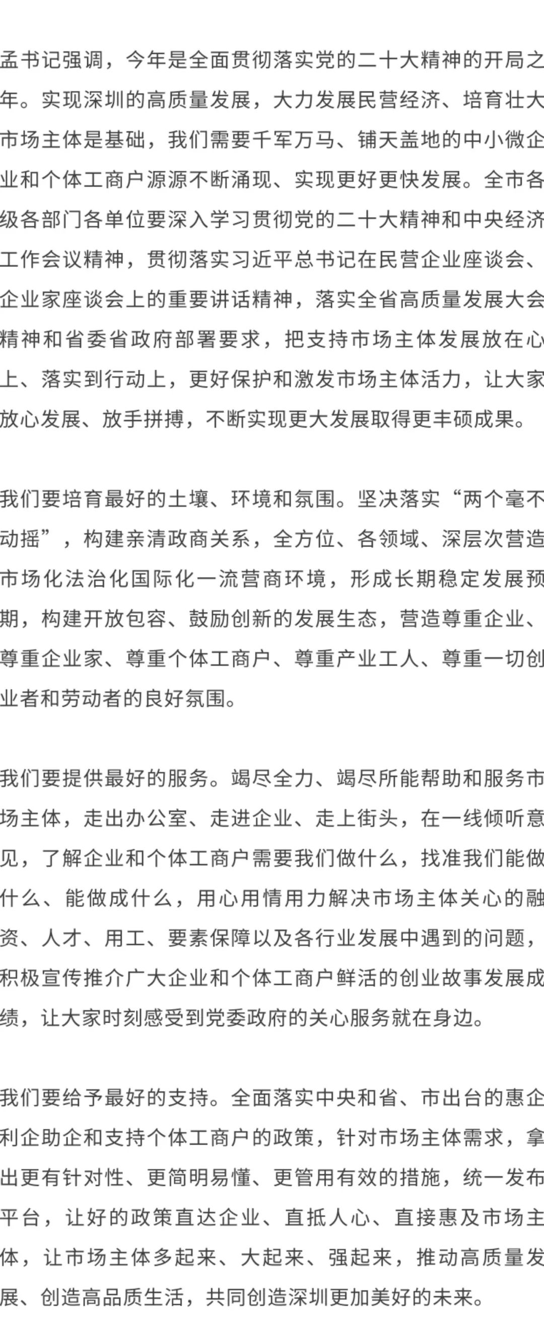 2月2日,深圳市召开中小微企业、个体工商户及行业协会座谈会,深入学习贯彻党的二十大精神和中央经济工作会议精神,贯彻落实习近平总书记在民营企业座谈会、企业家座谈会上的重要讲话精神,落实全省高质量发展大会精神和省委省政府部署要求,听取中小微企业、个体工商户和行业协会代表意见建议,加快推动广大民营企业和个体工商户实现更好更快发展,大力支持行业协会商会更好更大发挥作用,为全市高质量发展源源不断注入新动能新活力。