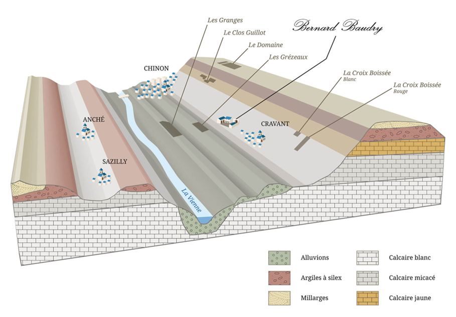 希侬产区(Chinon)土壤主要分为三类:冲积型土壤分布在维埃纳河(River Vienne)的两岸;被当地称为黄色钙石土(Yellow Tuffeau)的土伦阶白垩土(Turonian),这种土壤分布在维埃纳河(Vienne River)和卢瓦河(Loire River)的交汇处;硅酸粘土和沙土分布在平原和丘陵地带。