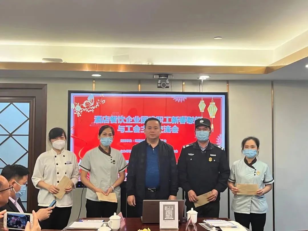 省酒店与餐饮行业协会秘书长、省酒店与餐饮行业工会联合会(市餐饮烹饪行业工会联合会)主席陈刚主持慰问交流。首先,他向与会的工会主席和困难职工代表致以节日问候和新春祝福。受省、市财贸工会委托,向8位企业困难职工代表送上慰问金,送去工会组织对困难职工的关心关怀。