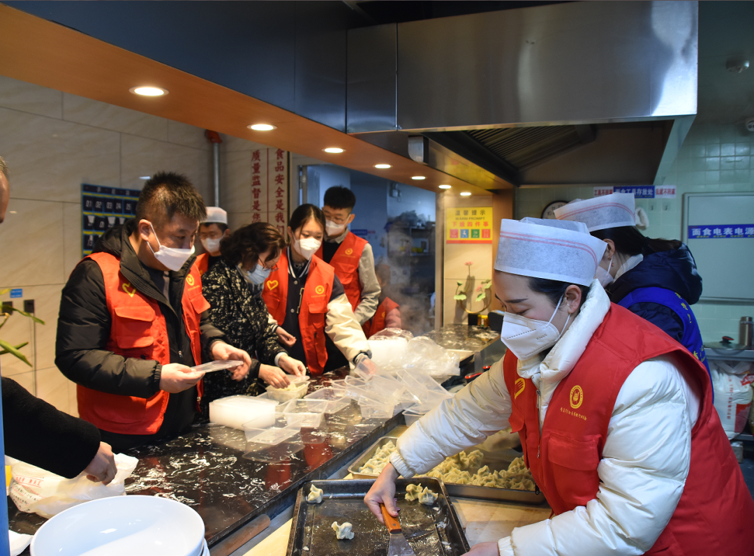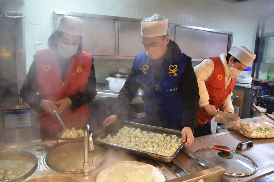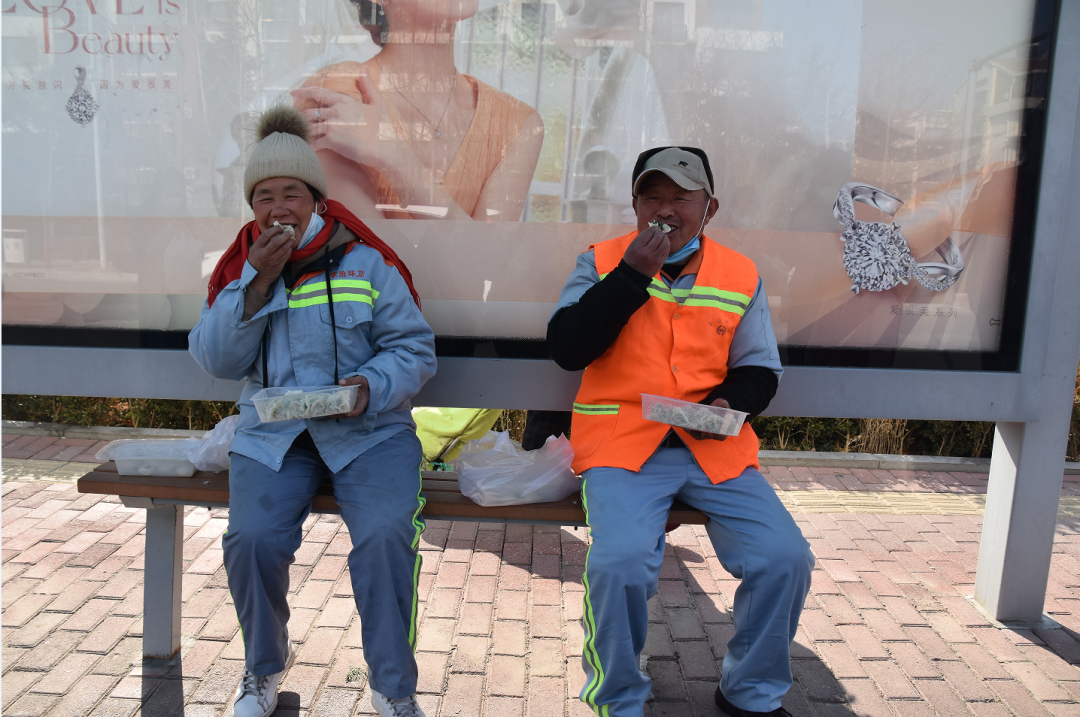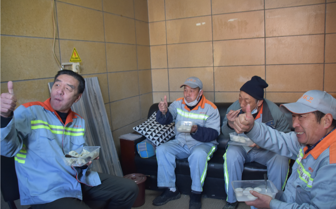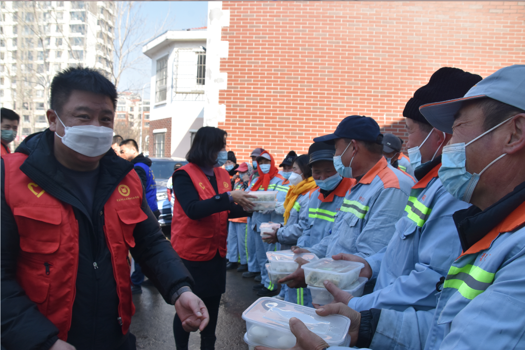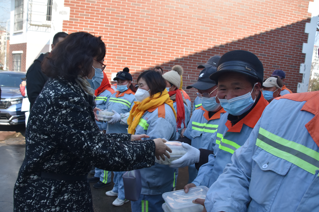 此次走访慰问的是青岛市李沧区清洁服务总公司六分道路保洁公司,负责李沧区200多万平方米、65条道路的清洁保障工作。一到现场,大家就尽快把热乎乎的水饺、元宵分发到环卫工人的手里,还有心海公益捐赠的价值16000元的枸杞液,并对环卫工人们送上了最诚挚的节日祝福。