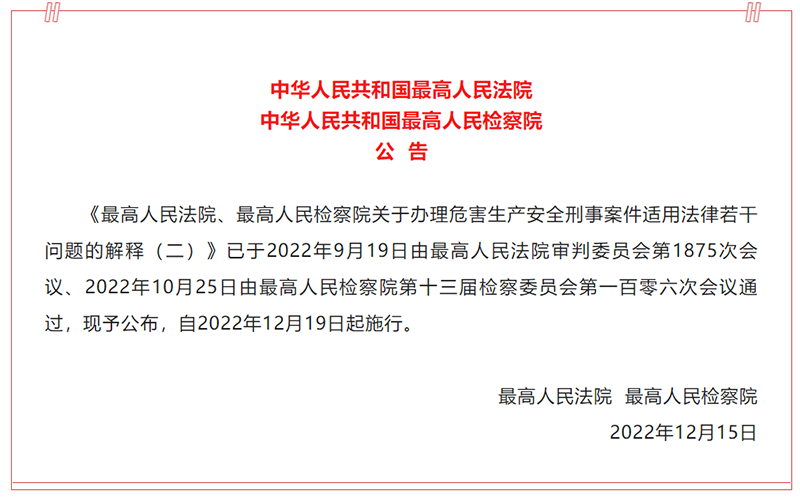 最高人民法院、最高人民检察院联合发布《关于办理危害生产安全刑事案件适用法律若干问题的解释(二)》