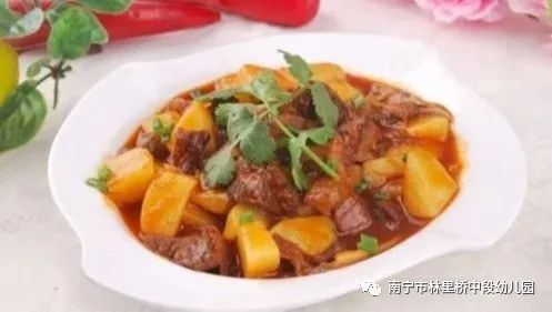 中餐:糙米香米饭 土豆焖牛腩 佛手瓜炒肉 蒜蓉炒鸡毛菜 鸭血肉沫粉丝汤