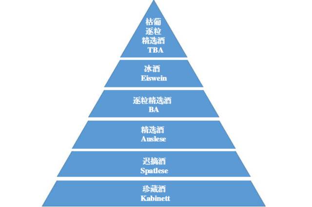 Qualitatswein mit Pradikat:简称 QmP,指高级优质葡萄酒,也可以称作 Pradikatswein。高级优质葡萄酒是德国葡萄酒中的最高等级,必须产自 39 个子产区,酿造过程中不允许人工加糖。这类酒从干型到甜型的都有,按照葡萄采摘时的自然含糖量高低,高级优质葡萄酒又可细分成 6 个等级,由低至高分别为:珍藏酒、迟摘酒、精选酒、逐粒精选酒、冰酒和枯葡逐粒精选酒。