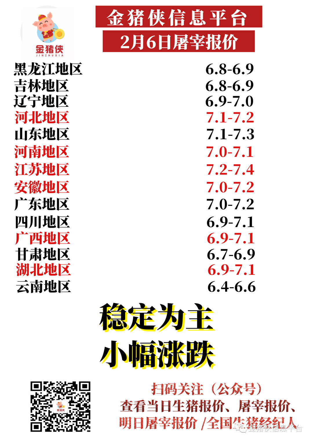 【金猪侠】2月6日屠宰企业收购价~【稳定为主、小幅涨跌】