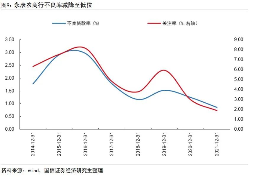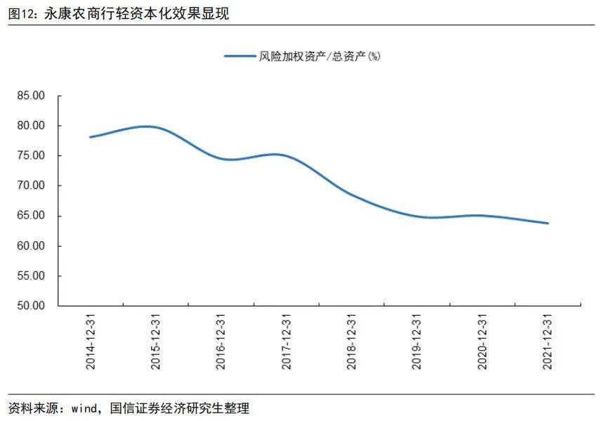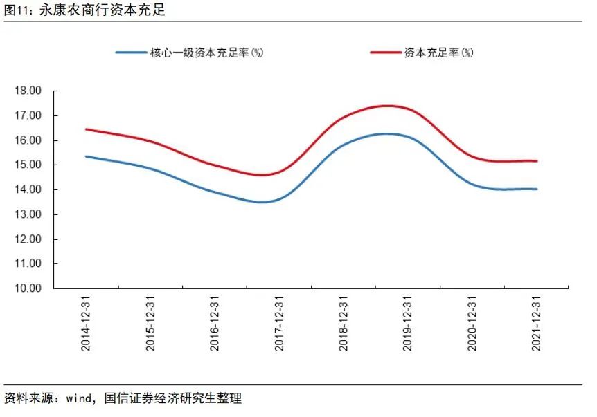 2021年末永康农商行资本充足率为15.17%,核心一级资本充足率为14.02%,资本充足能满足公司的快速扩张。且近年来,永康农商行持续增强非信贷业务的经营能力,“风险加权资产/总资产”比值持续下行,2021年末该比值为63.79%,较2016年末下降了11个百分点。