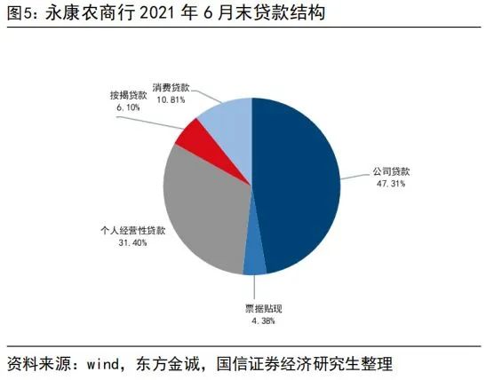 截止2021年末,公司贷款净额占总资产的比重为56.5%,投资类资产比重为30.7%,同业资产比重为6.7%,与其他农商行相似。贷款结构来看,2021年6月末对公贷款比重为47.31%、个人经营性贷款31.40%、按揭贷款6.10%、消费贷款10.81%。永康农商行多年来专注中小微企业,个人经营性贷款比重较高。