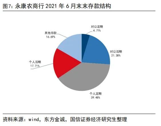 永康农商行存款占总负债比重长期处在90%以上。从存款结构来看,2021年6月末公司活期存款比重21.38%、公司定期存款比重4.71%,个人活期存款比重17.71%、个人定期存款比重39.48%、其他存款比重16.69%。公司对公存款中活期存款比重较高,主要受益于公司持续加强银政合作,与永康市财政局等政府机构、农村集体资金、事业单位以及城投公司等保持了良好的合作。