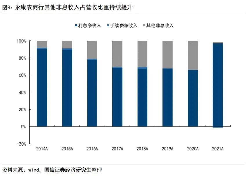 2016年以来永康农商行投资业务规模稳步提升,资金业务能力持续增强,其他非息收入占比持续提升,但手续费及佣金净收入可忽略不计。2020年其他非息收入占营收比重为34.1%。净利息收入占比为65.9%。但2021年受债市大幅调整冲击,公司其他非息收入大幅下降。
