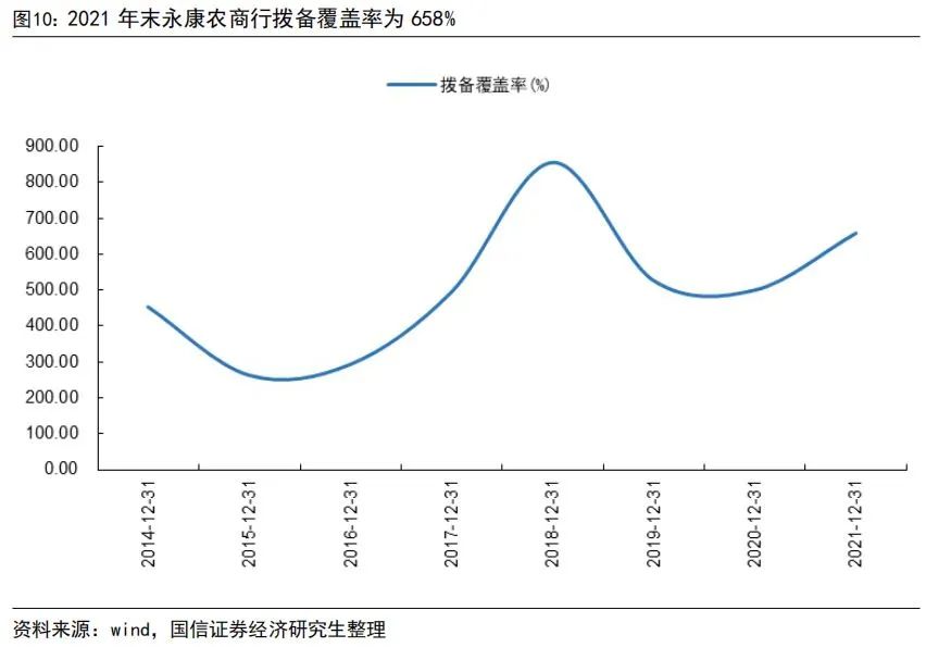 永康农商行近年来持续加大不良确认和处置,不良率和关注率指标均已经降至低位,存量包袱出清。截止2021年末,不良率0.86%,关注率1.86%,资产质量优异。受益于资产质量优化,2021年末公司拨备覆盖率提升至658.49%的高位,拨备安全垫充足。