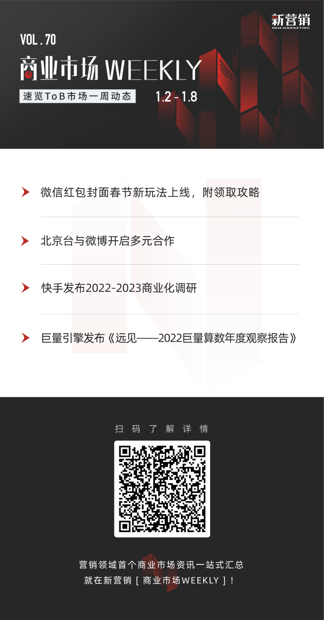 头部营销平台动态、最新营销产品、峰会资讯、招商资源及各类营销干货... 广告主、平台方、服务商亦或是关注营销的你,绝不能错过的商业市场资讯,就在新营销[商业市场WEEKLY] !
