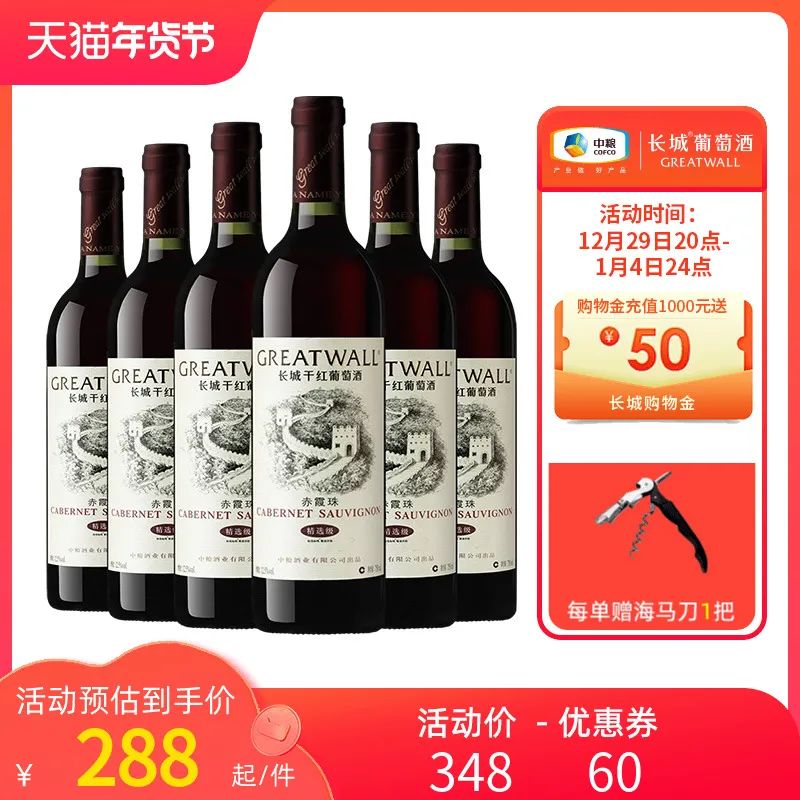 长城葡萄酒 精选白标赤霞珠干型红酒 整箱750mL6 官方旗舰店正品