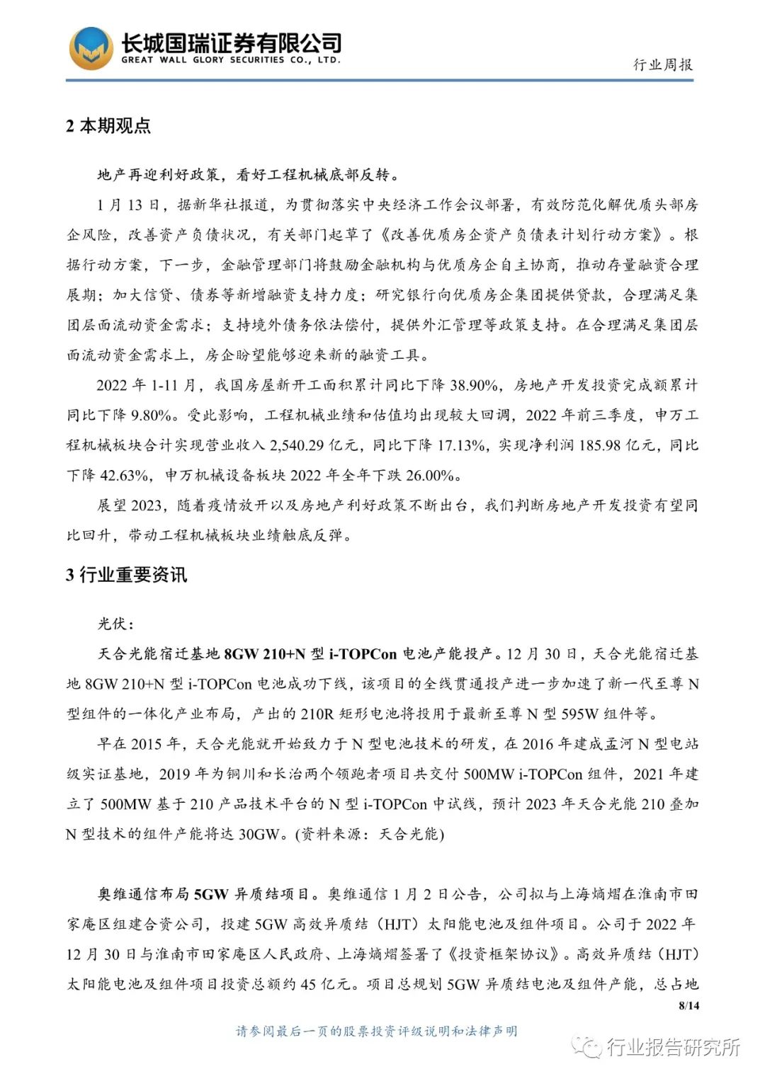 地产再迎利好政策,看好工程机械底部反转。1 月 13 日,据新华社报道,为贯彻落实中央经济工作会议部署,有效防范化解优质头部房企风险,改善资产负债状况,有关部门起草了《改善优质房企资产负债表计划行动方案》。