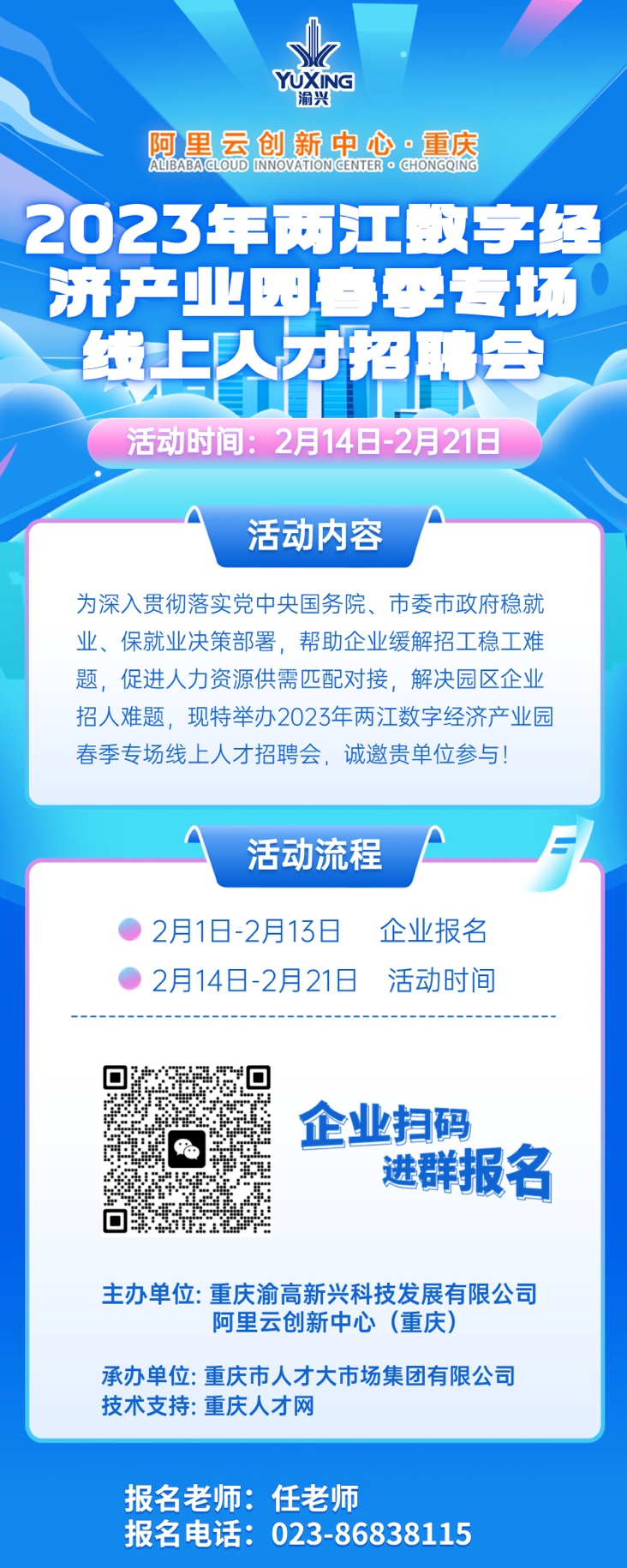 此次活动由重庆渝高新兴科技发展有限公司、阿里云创新中心(重庆)、重庆两江数字经济产业园·互联网园党群服务中心主办,重庆人才大市场集团有限公司承办,重庆人才网提供技术支持。