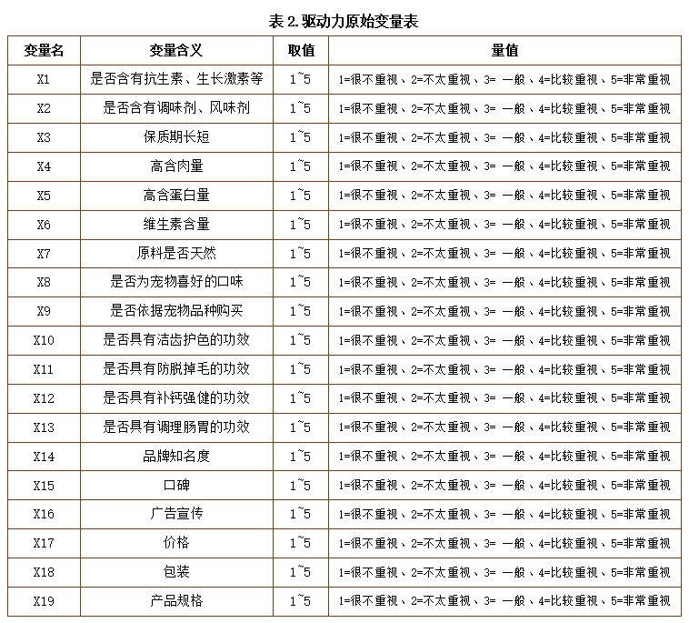 在此次调研中本小组从影响消费者购买宠物食品的内在和外在方面列举19个具有代表性的影响消费者进行消费的因素,通过因子分析寻找因子之间的相关性进行有效降维。