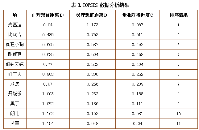 应用TOPSIS法对品牌进行综合评价,从而得到各品牌综合排序为:麦富迪>比瑞吉>疯狂小狗>耐威客>伯纳天纯>好主人>顽皮>开饭乐>奥丁>朗仕>灵萃。