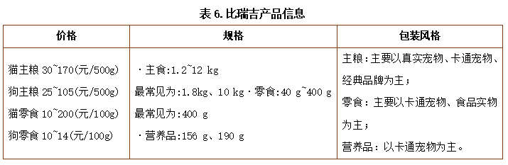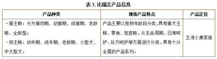 比瑞吉价格区间比麦富迪更大,包装风格更多元,但食品规格设定少于麦富迪,且其产品种类与大部分品牌以食品构成分类不一致,主要以宠物年龄段进行分类。此外,其主要发展宠物主食,宠物零食、营养品较少。比瑞吉的价格、规格和包装风格主要信息见表6。比瑞吉的产品种类、特点和定位主要信息见表7。