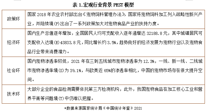 宠物行业背景方面,通过搜索相关文件和报道,结合社交平台和各类APP的资料等,利用 PEST分析模型对宠物食品行业发展驱动因素进行探析,总结如表1: