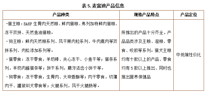 麦富迪的产品种类、产品特点和产品定位信息见表5: