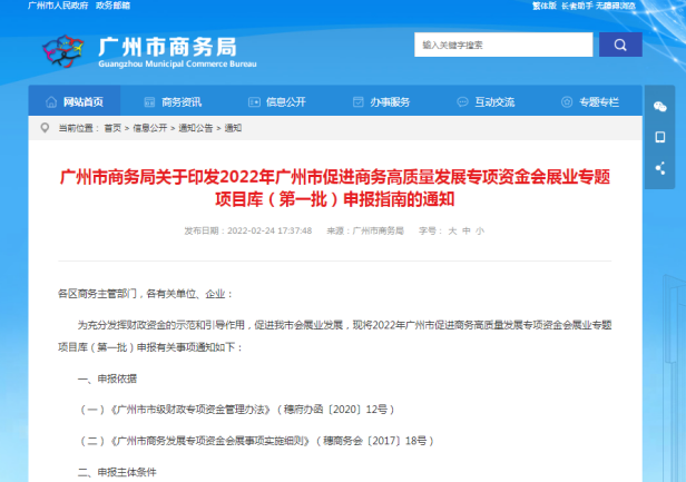2022年广州市商务局发布第一批、第二批《广州市促进商务高质量发展专项资金会展业专题项目库申报指南》左右滑动查看更多。