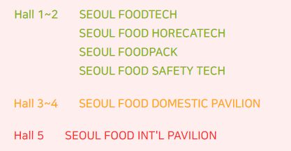 | 划分 | 食品设备 (SEOUL FOODTECH) 1-2 Hall | 韩国国内食品馆 (SEOUL FOOD DOMESTIC) 3-4 Hall | 国际食品馆 (SEOUL FOOD Int'l) 5 Hall |