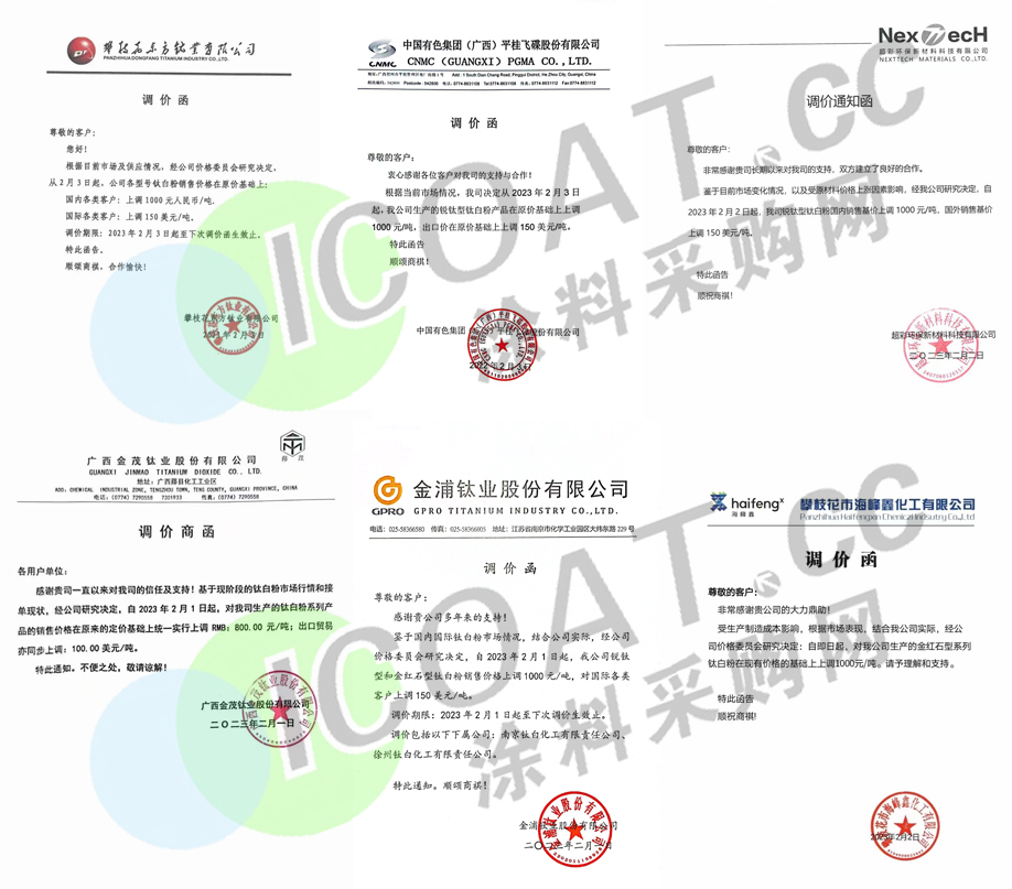 天原集团:2月1日起,针对国内市场,在原销售价格基础上,不同牌号氯化法钛白粉销售价格上调1000元/吨;针对国际市场,在原销售价格基础上,不同牌号氯化法钛白粉销售价格上调150美元/吨。
