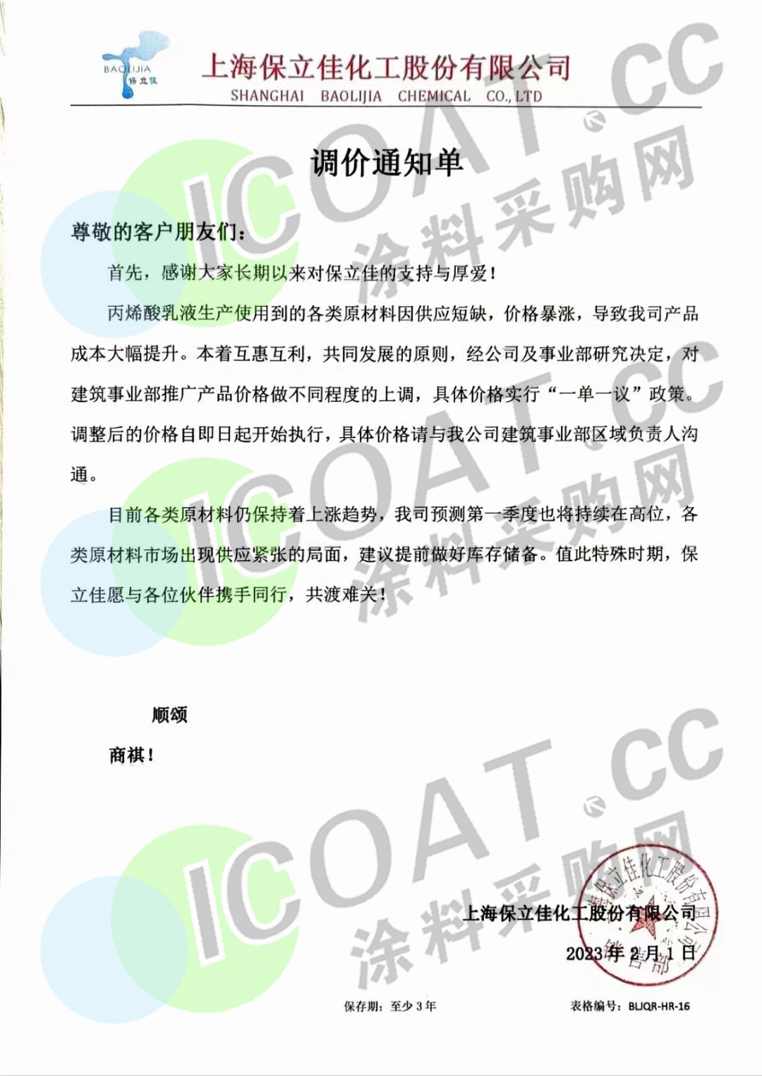 此前,国内乳液龙头企业保立佳也曾表示,丙烯酸乳液生产使用到的各类原材料因供应短缺,价格暴涨,导致产品成本大幅提升。经研究决定对建筑事业部推广产品价格做不同程度的上调,具体价格实行“一单一议”政策。