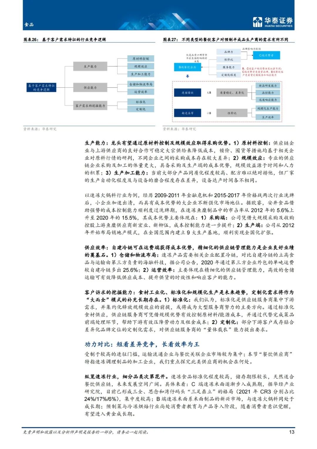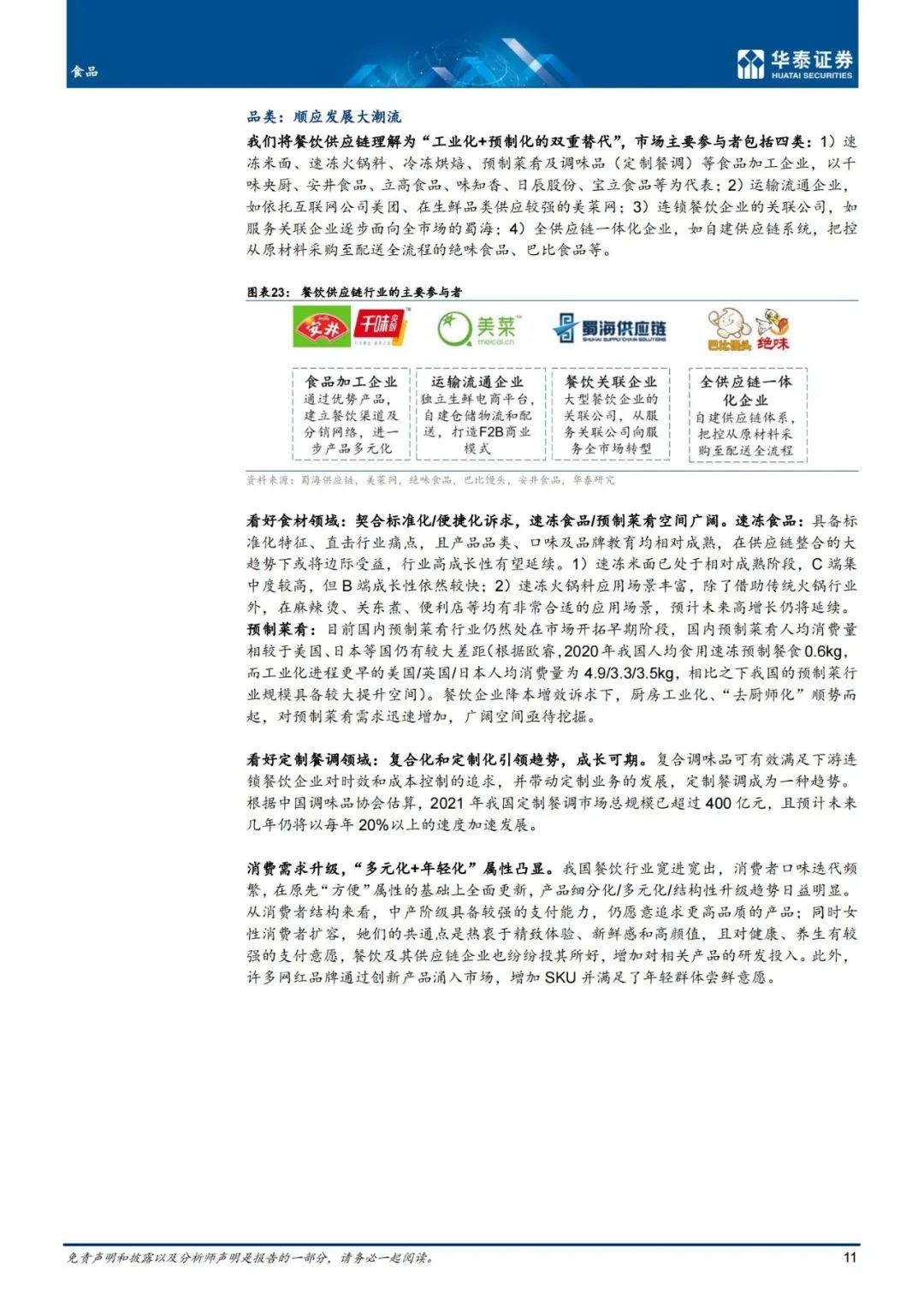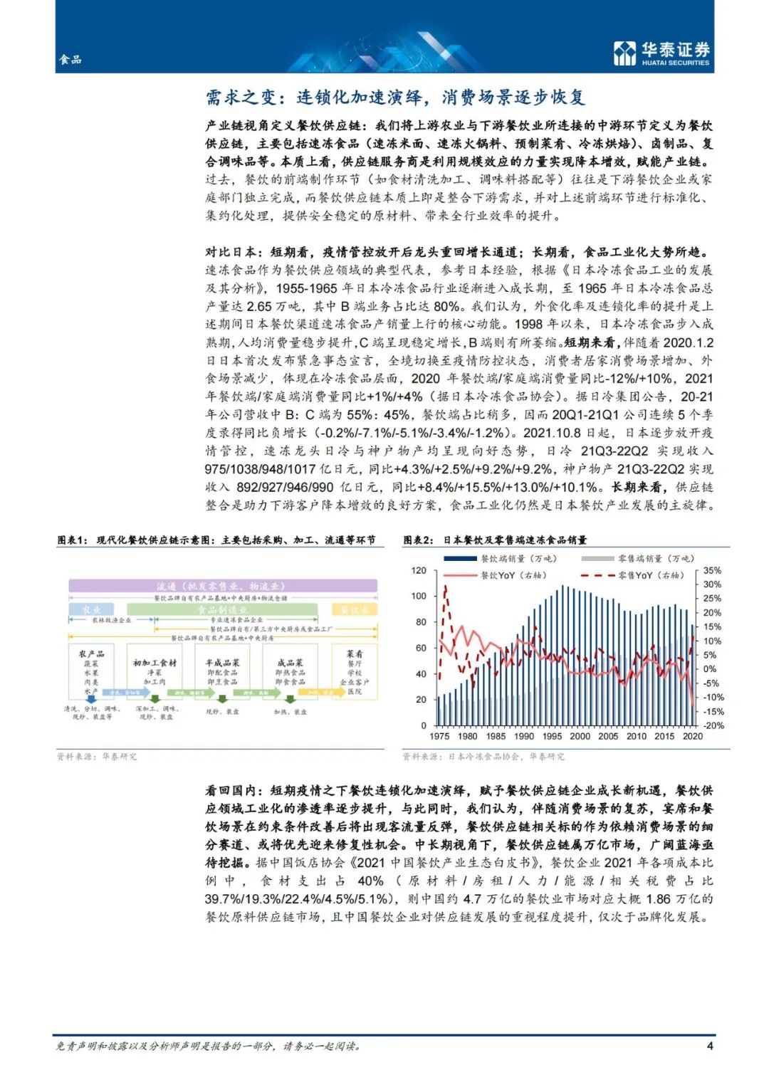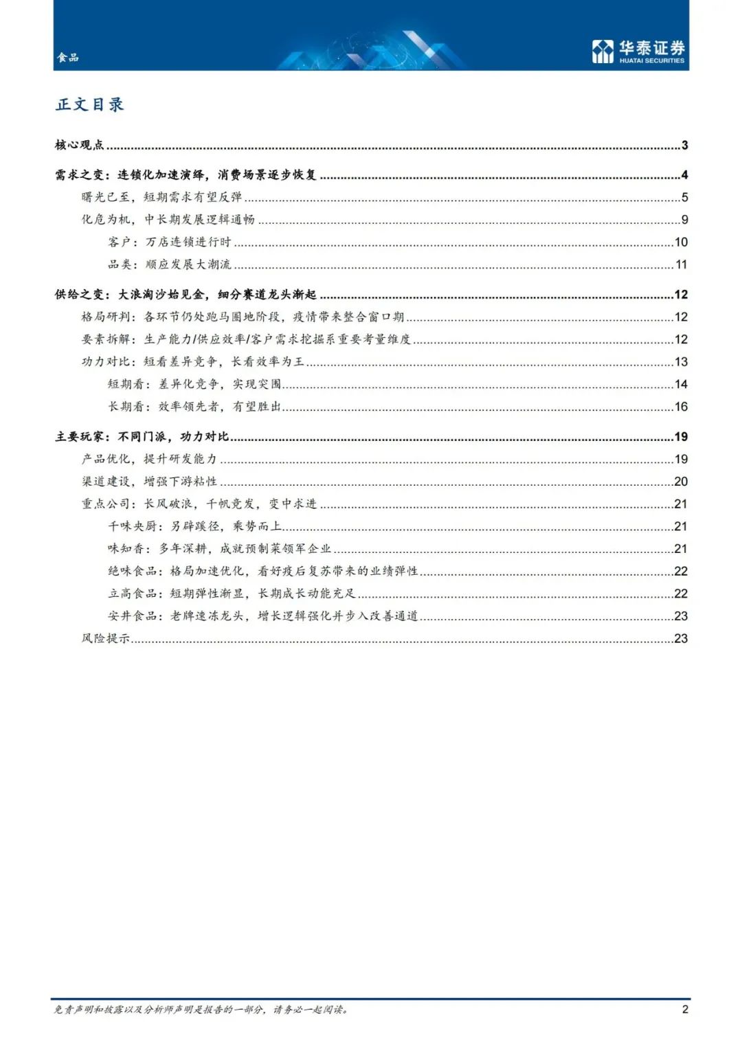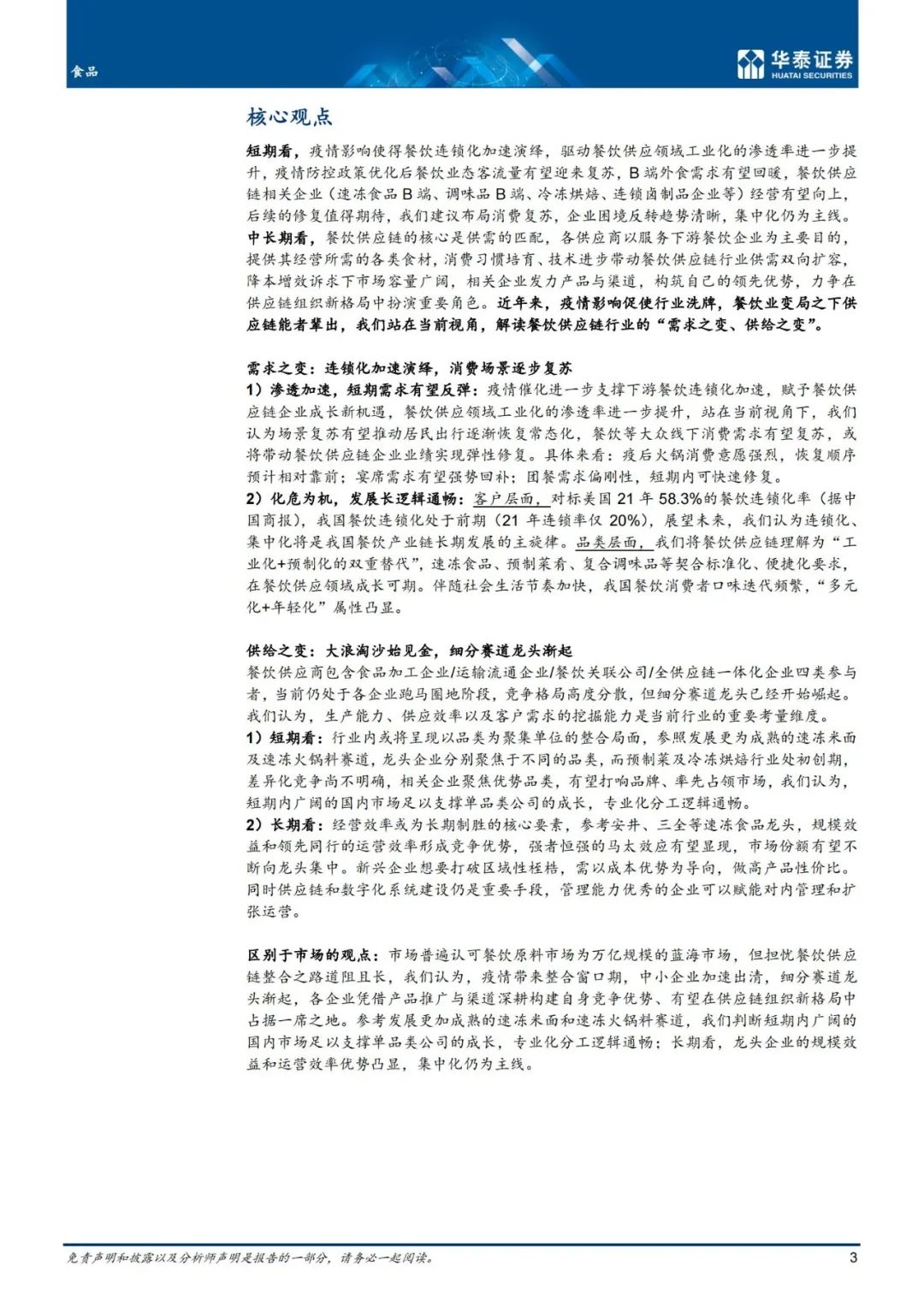 短期看,疫情影响使得餐饮行业连锁化加速演绎,驱动餐饮供应领域工业化的渗透率进一步提升,疫情防控政策优化后餐饮业态客流量有望迎来复苏,B 端外食需求有望回暖,餐饮供应链相关企业(速冻食品 B 端、调味品 B端、冷冻烘焙、连锁卤制品企业等)经营有望向上,后续的修复值得期待。中长期视角下,消费习惯培育、技术进步带动餐饮供应领域供需双向扩容,降本增效诉求下市场容量广阔,行业整体竞争格局稳态尚未形成,各细分领域龙头渐起。近年来,疫情影响促使行业洗牌,餐饮业变局之下供应链能者辈出,我们站在当前视角,解读餐饮供应链的“需求之变、供给之变”。短期:疫情影响使得下游餐饮连锁化加速演绎,赋予餐饮供应链企业成长新机遇,餐饮供应领域工业化的渗透率逐步提升,站在当下,我们认为,防疫政策改善优化是门店客流边际改善的重要驱动,多重政策推力下,餐饮等线下消费有望复苏,或将带动餐饮供应链企业实现业绩的弹性修复。中长期:展望未来,连锁化、集中化或将是我国餐饮产业链长期发展的主旋律。我们将餐饮供应链理解为“工业化+预制化的双重替代”,速冻食品/预制菜肴/复合调味品等契合标准化、便捷化要求,未来成长可期。伴随社会生活节奏加快,我国餐饮消费者口味迭代频繁,“多元化+年轻化”属性凸显。中国餐饮供应链仍处于成长期,竞争格局高度分散,当前仍处于各企业跑马圈地阶段,但细分赛道龙头渐起,生产能力/供应能力/客户需求的挖掘能力是当前餐饮供应链行业的重要考量维度。短期看:行业内或将呈现以品类为聚集单位的整合局面,参照发展更为成熟的速冻米面及速冻火锅料赛道,龙头企业分别聚焦于不同的品类,预制菜及冷冻烘焙行业处成长期,差异化竞争尚不明确,相关企业聚焦优势品类有望率先打响品牌、占领市场。长期看:参考安井食品/三全食品,规模效益和领先同行的运营效率形成竞争优势,强者恒强的马太效应显现,市场份额有望不断向龙头集中。(以下为报告正文节选,后台回复报告标题“餐饮供应链,长风破浪”,可获取完整报告。)大家好,由于微信推送功能改版,为了您能第一时间获取最新资讯,请您点击右下角的“点赞”+“在看”功能,这样微信会自动尽早把我们的资讯推送给您。