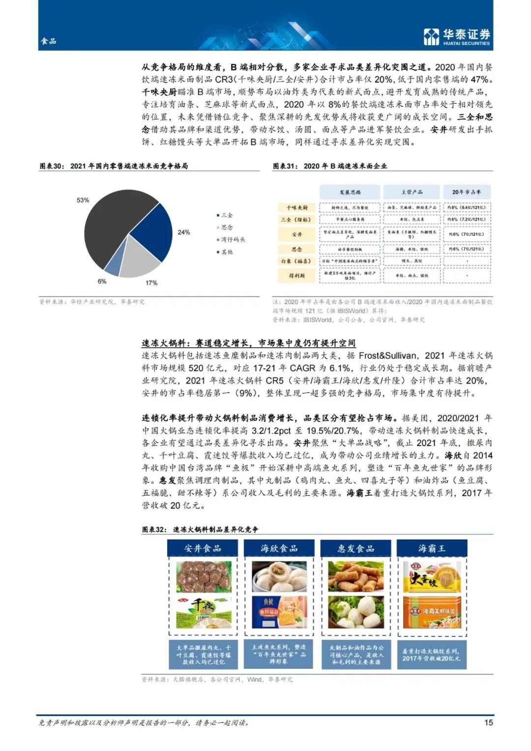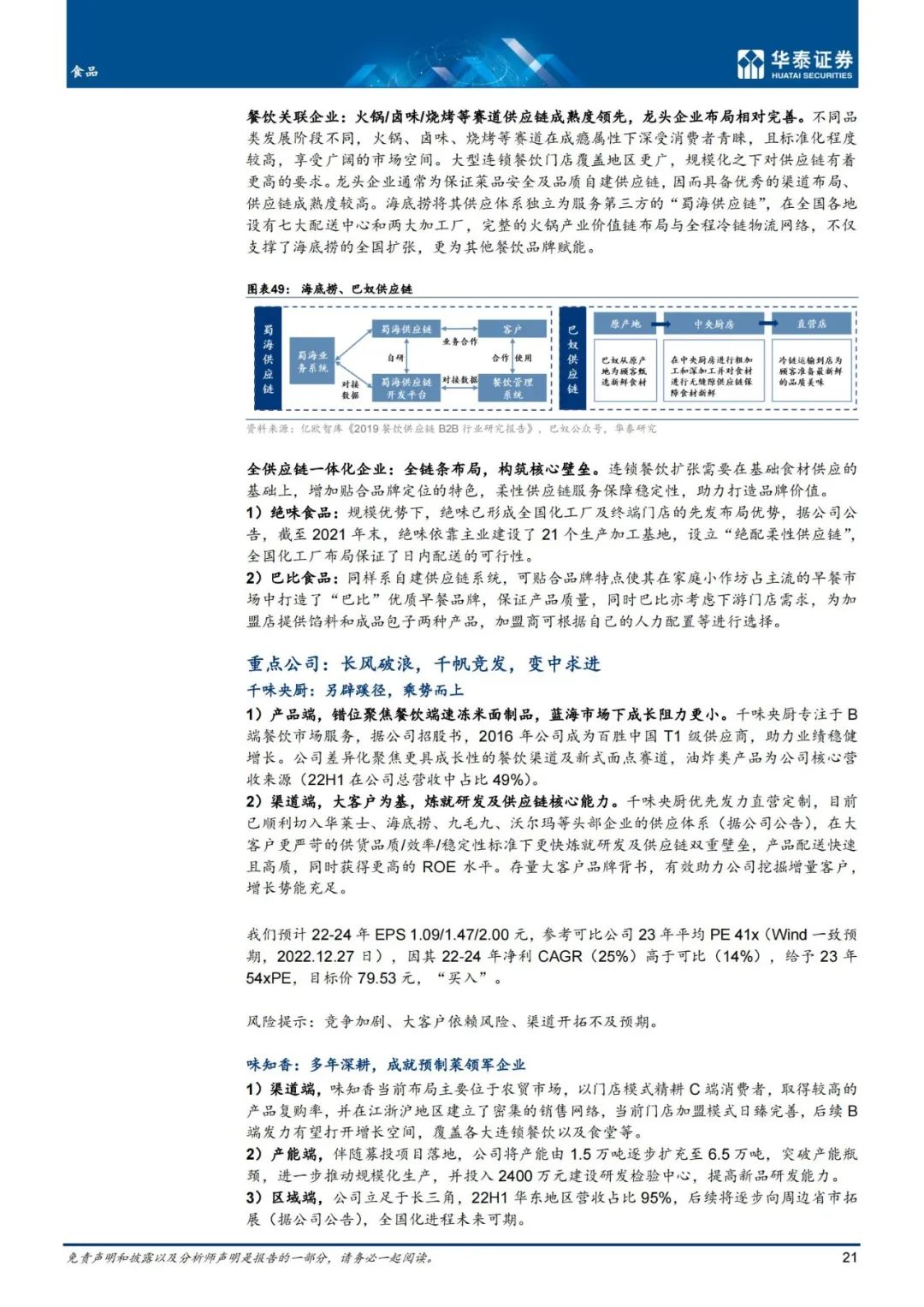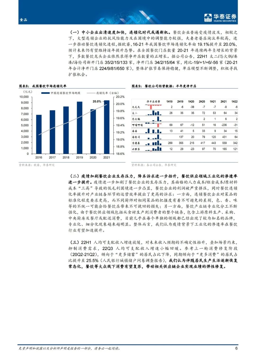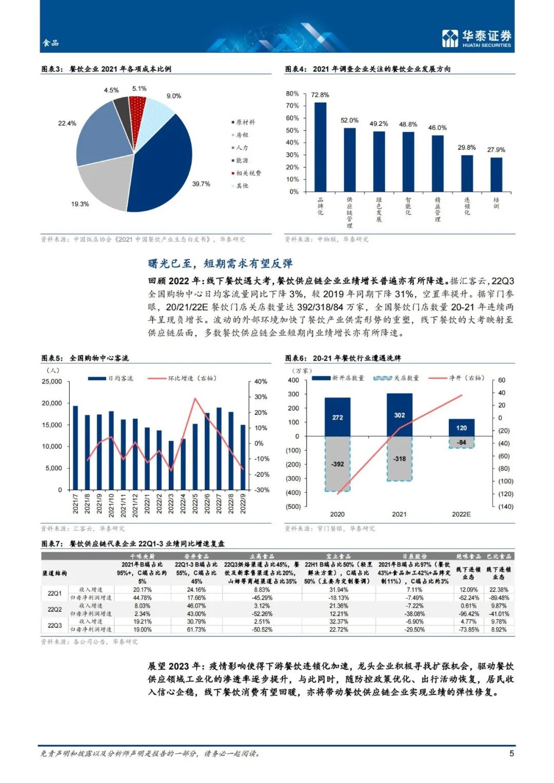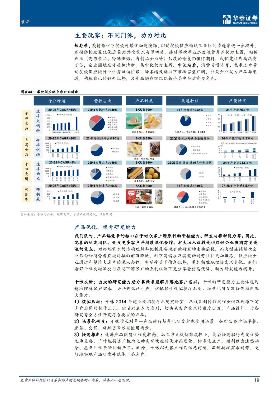 短期看,疫情影响使得餐饮行业连锁化加速演绎,驱动餐饮供应领域工业化的渗透率进一步提升,疫情防控政策优化后餐饮业态客流量有望迎来复苏,B 端外食需求有望回暖,餐饮供应链相关企业(速冻食品 B 端、调味品 B端、冷冻烘焙、连锁卤制品企业等)经营有望向上,后续的修复值得期待。中长期视角下,消费习惯培育、技术进步带动餐饮供应领域供需双向扩容,降本增效诉求下市场容量广阔,行业整体竞争格局稳态尚未形成,各细分领域龙头渐起。近年来,疫情影响促使行业洗牌,餐饮业变局之下供应链能者辈出,我们站在当前视角,解读餐饮供应链的“需求之变、供给之变”。短期:疫情影响使得下游餐饮连锁化加速演绎,赋予餐饮供应链企业成长新机遇,餐饮供应领域工业化的渗透率逐步提升,站在当下,我们认为,防疫政策改善优化是门店客流边际改善的重要驱动,多重政策推力下,餐饮等线下消费有望复苏,或将带动餐饮供应链企业实现业绩的弹性修复。中长期:展望未来,连锁化、集中化或将是我国餐饮产业链长期发展的主旋律。我们将餐饮供应链理解为“工业化+预制化的双重替代”,速冻食品/预制菜肴/复合调味品等契合标准化、便捷化要求,未来成长可期。伴随社会生活节奏加快,我国餐饮消费者口味迭代频繁,“多元化+年轻化”属性凸显。中国餐饮供应链仍处于成长期,竞争格局高度分散,当前仍处于各企业跑马圈地阶段,但细分赛道龙头渐起,生产能力/供应能力/客户需求的挖掘能力是当前餐饮供应链行业的重要考量维度。短期看:行业内或将呈现以品类为聚集单位的整合局面,参照发展更为成熟的速冻米面及速冻火锅料赛道,龙头企业分别聚焦于不同的品类,预制菜及冷冻烘焙行业处成长期,差异化竞争尚不明确,相关企业聚焦优势品类有望率先打响品牌、占领市场。长期看:参考安井食品/三全食品,规模效益和领先同行的运营效率形成竞争优势,强者恒强的马太效应显现,市场份额有望不断向龙头集中。(以下为报告正文节选,后台回复报告标题“餐饮供应链,长风破浪”,可获取完整报告。)大家好,由于微信推送功能改版,为了您能第一时间获取最新资讯,请您点击右下角的“点赞”+“在看”功能,这样微信会自动尽早把我们的资讯推送给您。