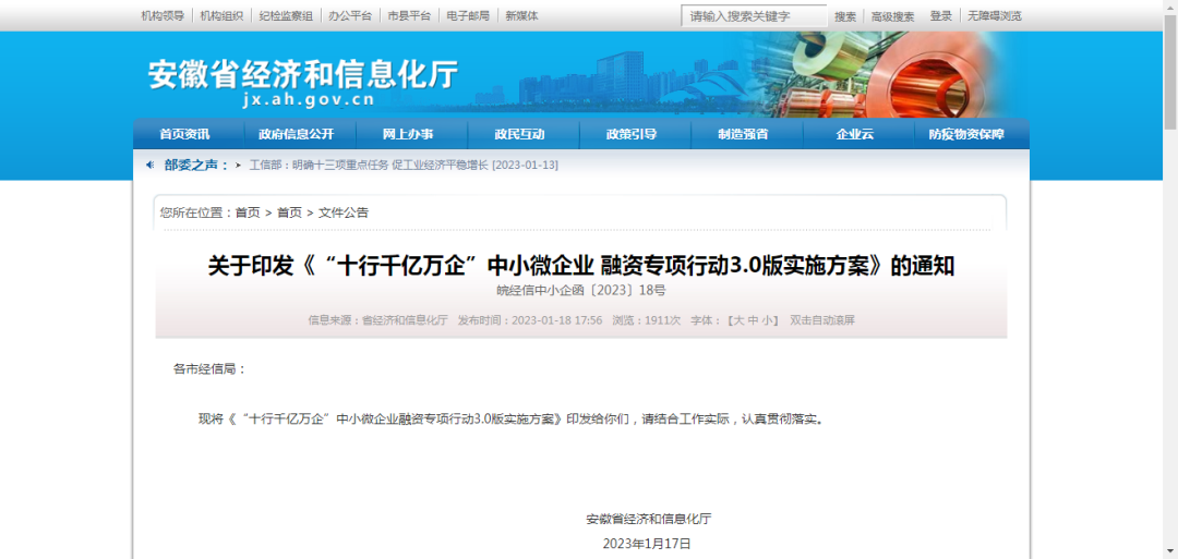 (二)加大宣传推广。各级经信部门、各合作银行分支机构要采取多种形式加大政策宣讲,提升企业对专项行动知晓度,认真做好融资需求对接情况的跟踪、统计、分析、评估,加强对专项行动推进落实情况的调度,按月将工作进展情况报送至省经济和信息化厅、各合作银行。各市经信部门要在政银企对接活动举办当月填报《“十行千亿万企”融资专项行动政银企对接活动统计表》(附件2),并报送至省经济和信息化厅。各合作银行分别在每月8日前、每季度10日前,将上月专项信贷发放情况及上季度合作对接情况报送至省经济和信息化厅。有关银企合作成效、典型经验做法将适时上报省委省政府、工业和信息化部、各合作银行总行。 来源:安徽省经济和信息化厅