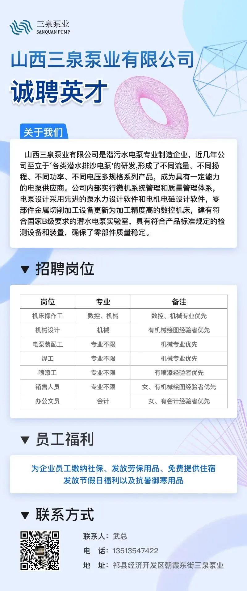 山西三泉泵业有限公司招聘啦!大量岗位等你来咨询!