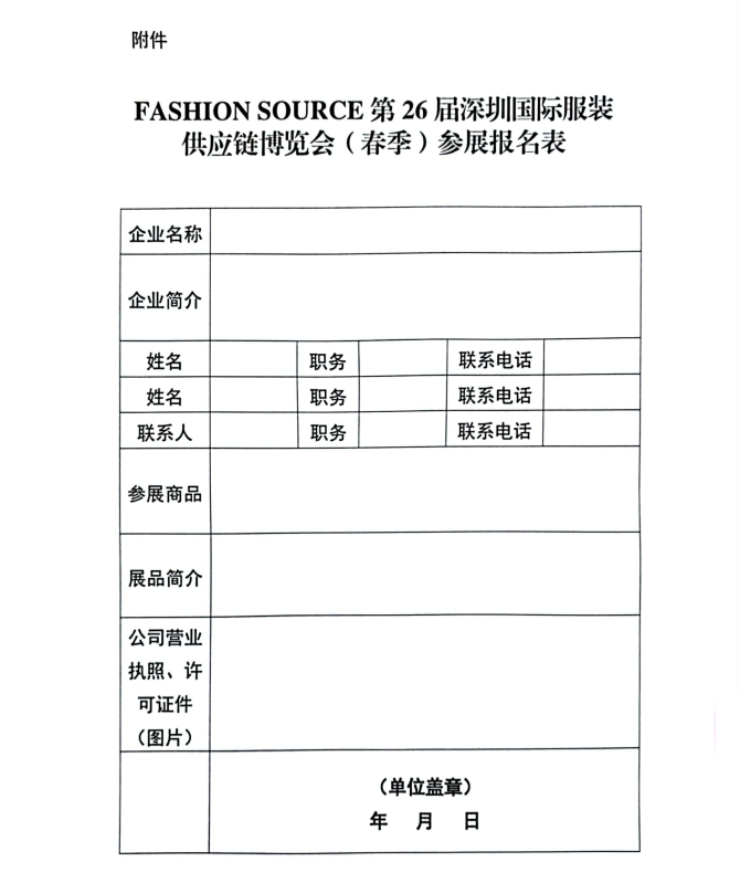 附件:FASHION SOURCE第26届深圳国际服装供应链博览会(春季)参展报名表(联系人:李艳霞,联系电话:18647748808)